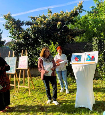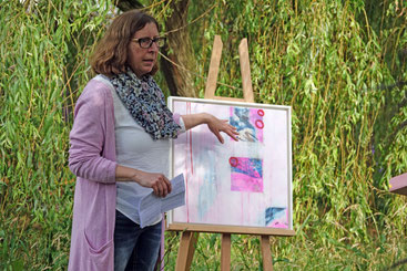 Ausstellung mit Lesung, Juli 2023 bei der Sommerbegegnung von Heike Jourdan in Wixhausen. Andrea Eckstein las selbst verfasste Texte zu meinen ausgestellten Bildern.
